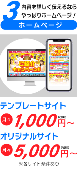 ホームページがない場合、ホームページのご用意をお願いしております。お持ちでない方は弊社にてレンタルホームページをご依頼していただくことも可能です。もしくは、チラシを作られた方はチラシをweb広告としてデジタルチラシに変換することも可能です。