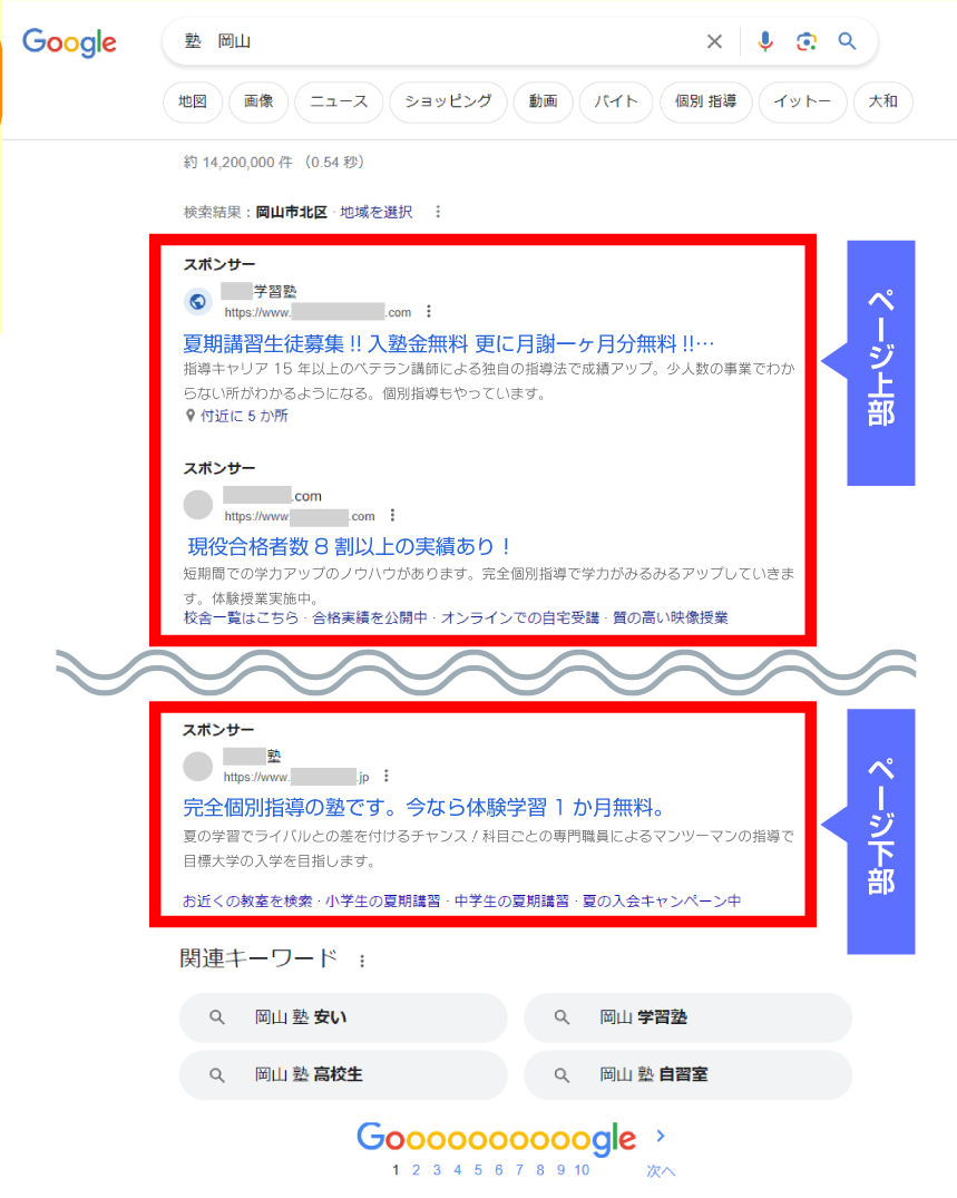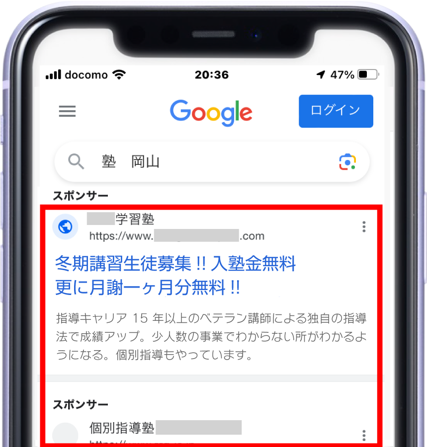例えば、スマートフォンで「塾 岡山」と検索した人に下記のような広告を表示させます。※塗装、リフォーム、整体など何でも可能です。